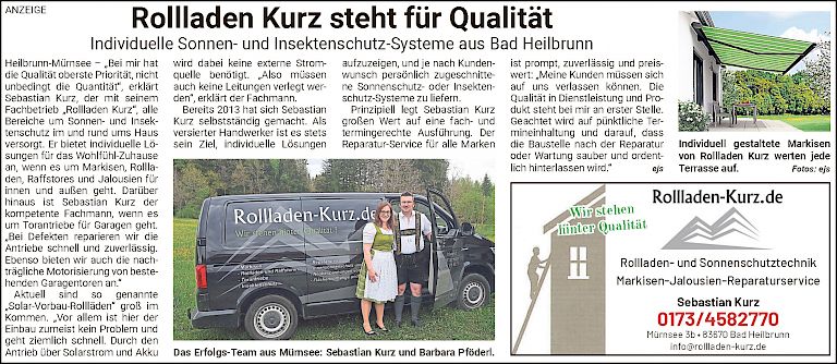 Im aktuellen Zeitungsartikel erfahren Sie mehr über die Werte, Leistungen und Leidenschaft, mit der Rollladen Kurz seit 2013 individuelle Sonnenschutz- und Reparaturlösungen in der Region bietet.